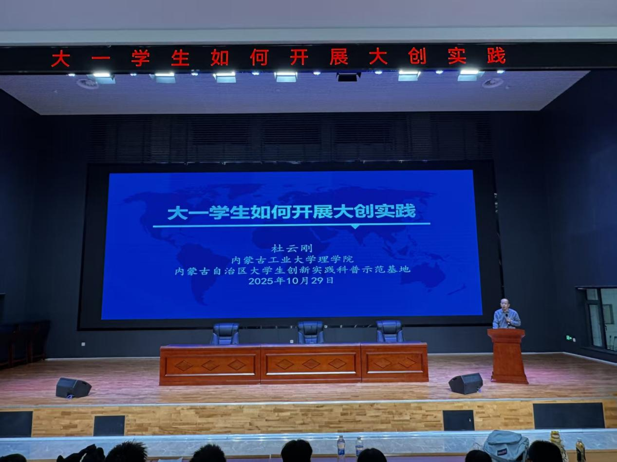 为帮助大一学生快速掌握创新创业实践的入门方法,激发新生参与大创活动的积极性,10月29日晚,学院于信息大楼A115教室举办“大一学生如何开展大创实践”专题讲座。本次讲座由内蒙古工业大学理学院杜云刚教授主讲,教学院长陈思主持,全体大一学生及指导教师共300余人到场聆听,共同开启创新创业实践的启蒙之旅。